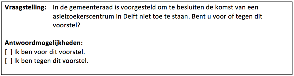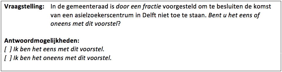 dinsdag 03 mei 2016 10:00 Vorige maand hebben we als fractie tegen het inleidende verzoek voor een referendum 'geen AZC' gestemd, ook al voldeed het verzoek aan de Delftse Referendum verordening. Dat deden we niet omdat het onderwerp ons toevallig niet goed uitkomt, maar omdat we de maatschappelijke effecten van zo’n referendum niet voor onze rekening willen nemen. Zie daarvoor dit bericht op onze site. Ik sloot dat stuk af met de zinnen: “De indieners van het referendum en de referendumkamer hebben nu de zware verantwoordelijkheid om de vraagstelling en de antwoordcategorieën zodanig te verwoorden dat verwarring en polarisatie zoveel mogelijk voorkomen worden. We wensen hen daar veel wijsheid bij toe.”